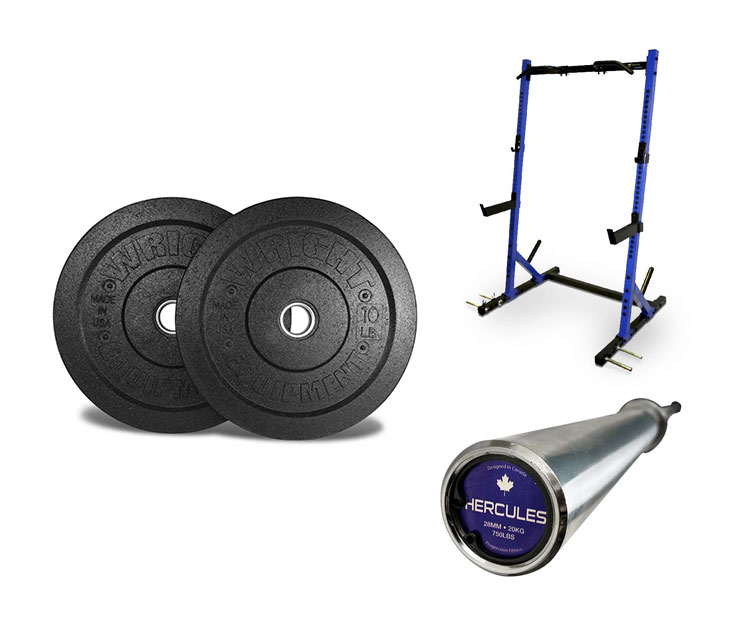 Package includes X-plode Half Rack, Progression Hercules 86" Olympic Weight Bar (750lbs), Wright USA Crumb Weight set - 260lbs, and spring clips.